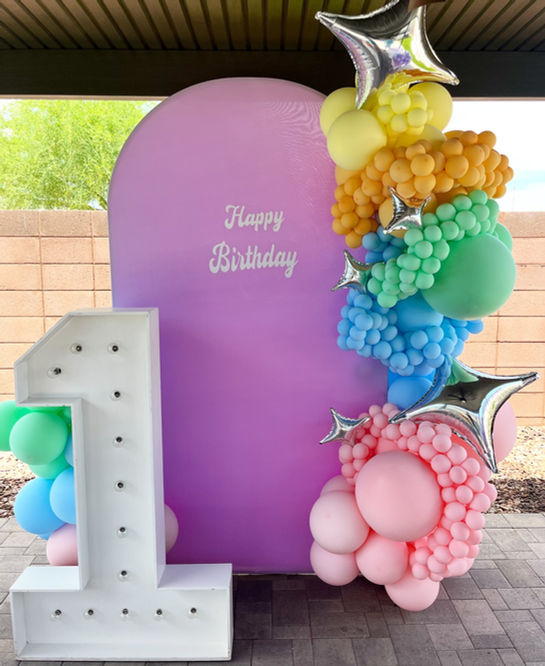 Arch/Backdrop Displays are one of our most popular options among clients! They are very versatile and include backdrop color/design of your choice as well as custom font for your backdrop. Balloon garlands follow along the arch in a curved/arch pattern, or can simply go up the sides in a vertical direction. The sky is the limit with options and choices of color, design, and font. LED sign lighting is also an available add-on for this popular style of balloon display! All types of foils, florals, LED signage, and custom font are an option dependent upon event and client request. We have various sizes of arch height available ranging from 6'-7.5' in height. If a custom backdrop is desired, accommodations will be made with time permitting and will be added onto the existing service price.